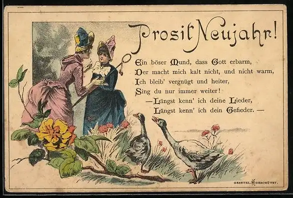 Lithographie Klatschmäuler und Gänse, frauenfeindlicher Humor