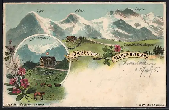 Lithographie Kleine Scheidegg-Wengernalp, Hotel Wengernalp mit Eiger, Mönch u. Jungfrau