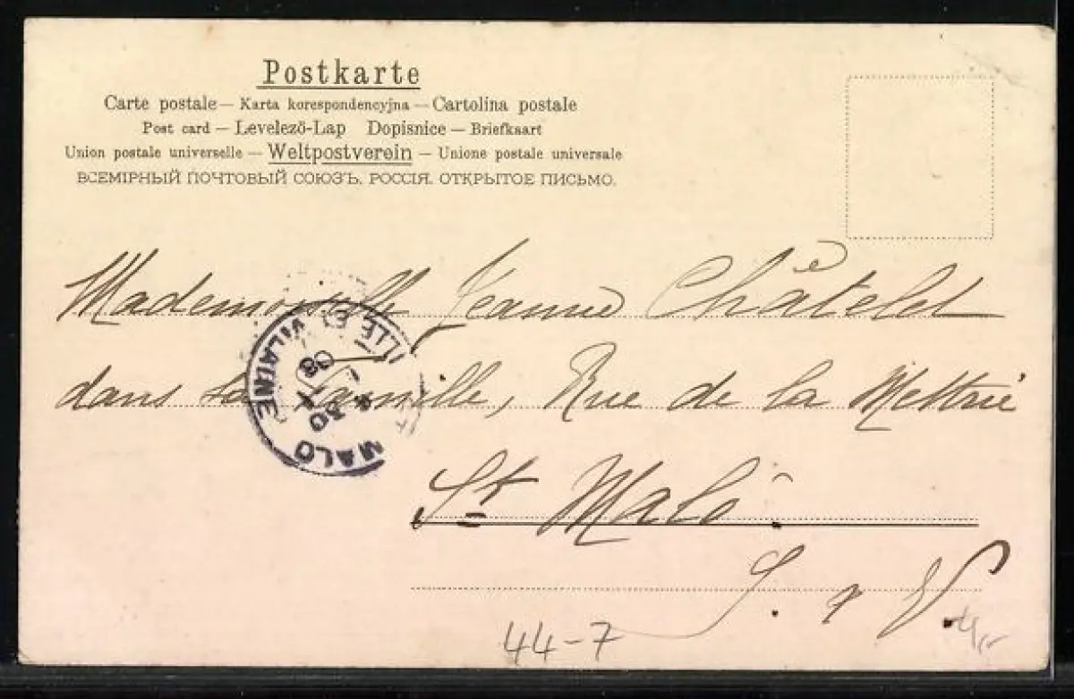 Personenbezogene Daten auf der Rückseite der Karte wurden durch blauen Textmarker unkenntlich gemacht. Die blauen Stellen sind auf die Vorderseite durchgeweicht und wirken sich negativ auf das Postkartenfoto aus