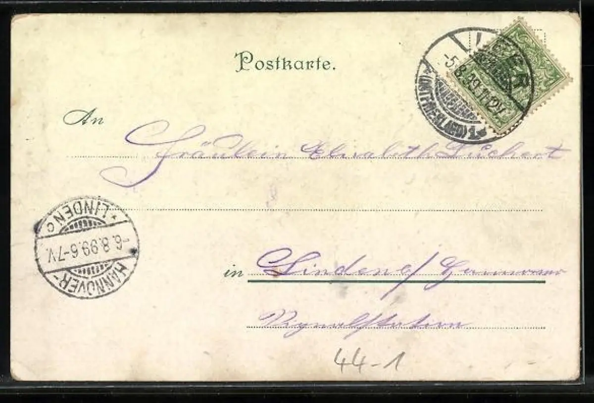 Personenbezogene Daten auf der Rückseite der Karte wurden durch blauen Textmarker unkenntlich gemacht. Die blauen Stellen sind auf die Vorderseite durchgeweicht und wirken sich negativ auf das Postkartenfoto aus