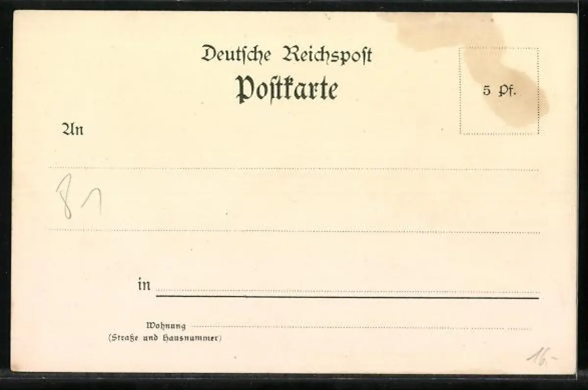 Personenbezogene Daten auf der Rückseite der Karte wurden durch blauen Textmarker unkenntlich gemacht. Die blauen Stellen sind auf die Vorderseite durchgeweicht und wirken sich negativ auf das Postkartenfoto aus