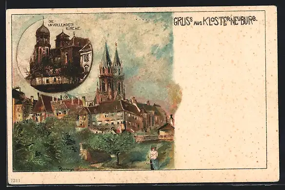 Lithographie Klosterneuburg, Die Unvollendete Kirche, Ortspartie mit Kirche