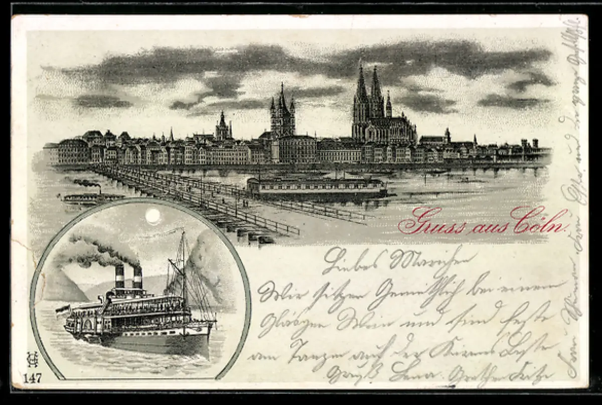 Lithographie Köln, Dom, Rheinbrücke, Dampfschiff