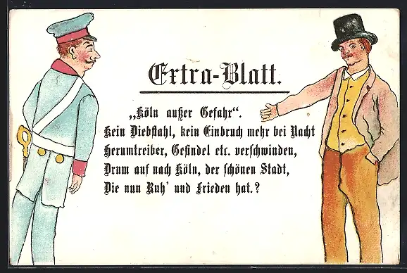 Lithographie Köln, Extrablatt: Köln ausser Gefahr, Polizist und Passant