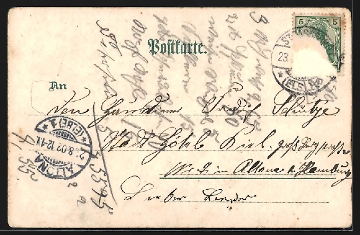 Personenbezogene Daten auf der Rückseite der Karte wurden durch blauen Textmarker unkenntlich gemacht. Die blauen Stellen sind auf die Vorderseite durchgeweicht und wirken sich negativ auf das Postkartenfoto aus