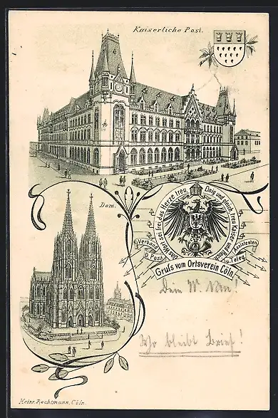 Lithographie Köln, Kaiserliche Post, Dom, Wappen