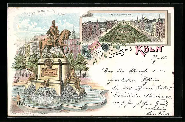 Lithographie Köln-Neustadt, Kaiser Wilhelm-Denkmal, Kaiser-Wilhelm-Ring