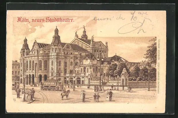 Lithographie Köln-Neustadt, Strassenpartie vorm Neuen Stadttheater, Strassenbahn