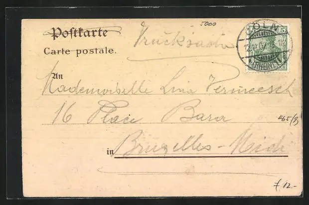 Personenbezogene Daten auf der Rückseite der Karte wurden durch blauen Textmarker unkenntlich gemacht. Die blauen Stellen sind auf die Vorderseite durchgeweicht und wirken sich negativ auf das Postkartenfoto aus