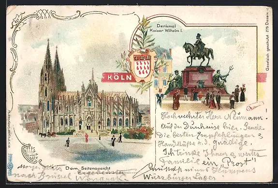 Lithographie Köln, Seitenansicht des Doms, Denkmal Kaiser Wilhelm I., Wappen um 1900