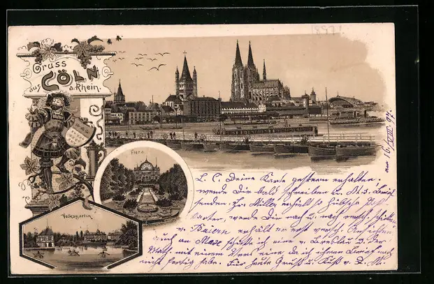 Lithographie Köln, Teilansicht mit Pontonbrücke, Volksgarten, Flora