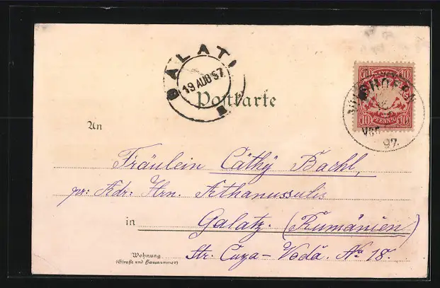Personenbezogene Daten auf der Rückseite der Karte wurden durch blauen Textmarker unkenntlich gemacht. Die blauen Stellen sind auf die Vorderseite durchgeweicht und wirken sich negativ auf das Postkartenfoto aus