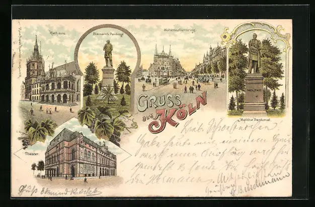 Lithographie Köln, Theater, Rathaus, Bismarck-Denkmal