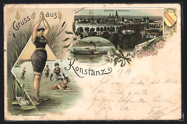 Lithographie Konstanz, Bodensee Dampfer, Totalansicht v. d. Seestrasse, Bademode