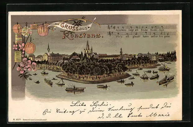 Lithographie Konstanz, Boote vor mit Lampions erleuchtetem Ufer mit Blick auf die Stadt