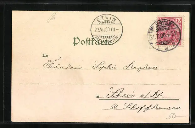 Personenbezogene Daten auf der Rückseite der Karte wurden durch blauen Textmarker unkenntlich gemacht. Die blauen Stellen sind auf die Vorderseite durchgeweicht und wirken sich negativ auf das Postkartenfoto aus