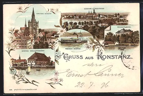Lithographie Konstanz, Concilium, Bodensee-Dampfer, Ortspartie mit Münster