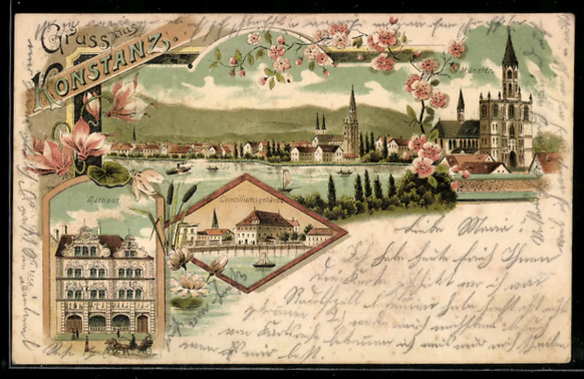 Lithographie Konstanz, Münster, Rathaus, Conciliumsgebäude