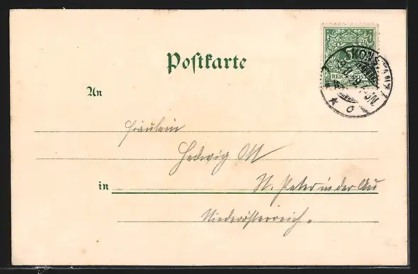 Personenbezogene Daten auf der Rückseite der Karte wurden durch blauen Textmarker unkenntlich gemacht. Die blauen Stellen sind auf die Vorderseite durchgeweicht und wirken sich negativ auf das Postkartenfoto aus