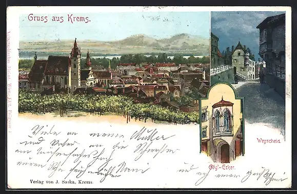 Lithographie Krems /N.-Oe., Ortsansicht aus der Vogelschau