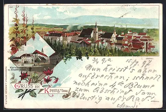 Lithographie Krems a. Donau, Körnermarkt mit Stadttheater, Panorama mit Kirchturm