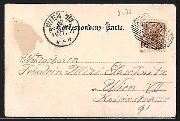 gelaufen 1897, Oberflächenschaden rückseitig, Stempelspur, guter Zustand