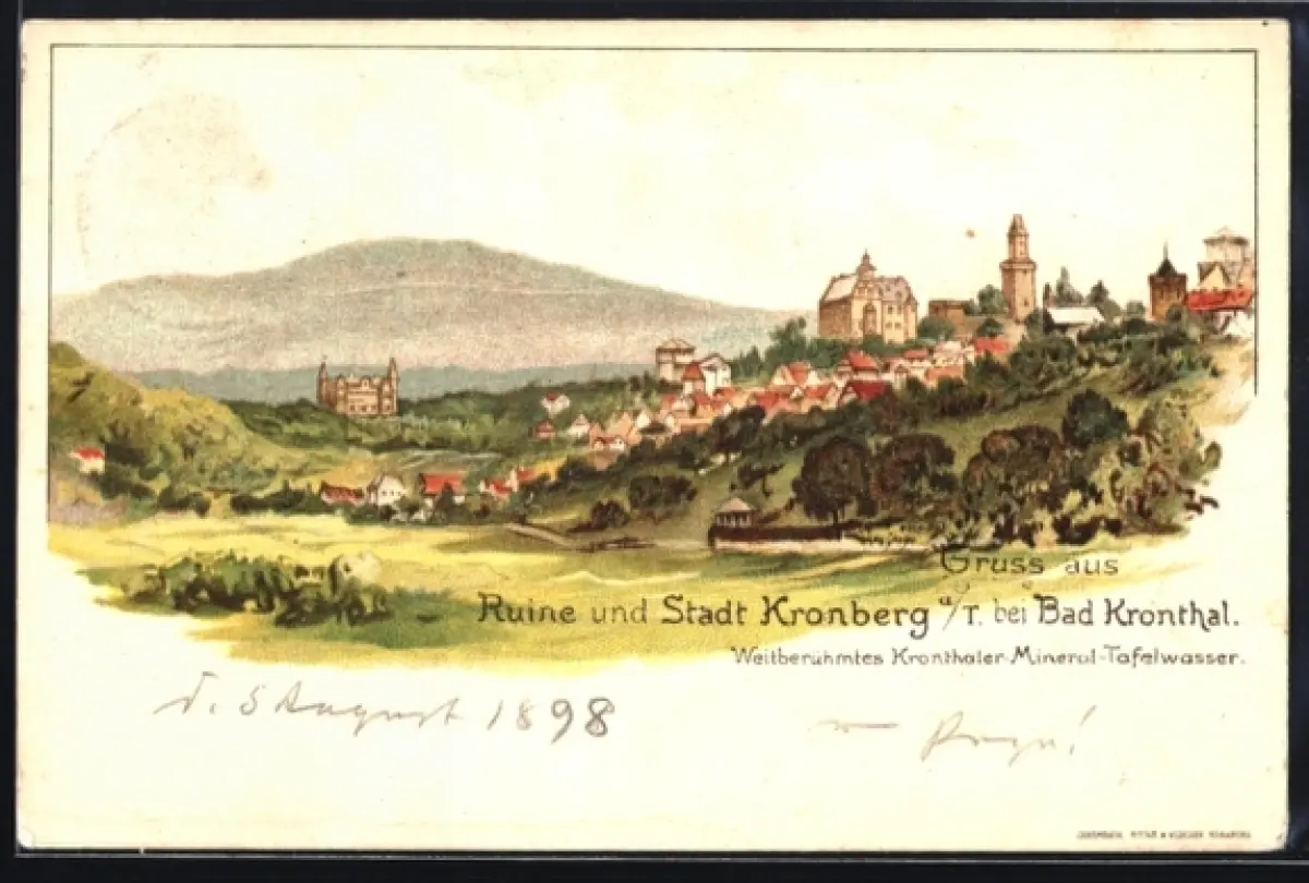 Lithographie Kronberg a. T., Ortsansicht mit Ruine