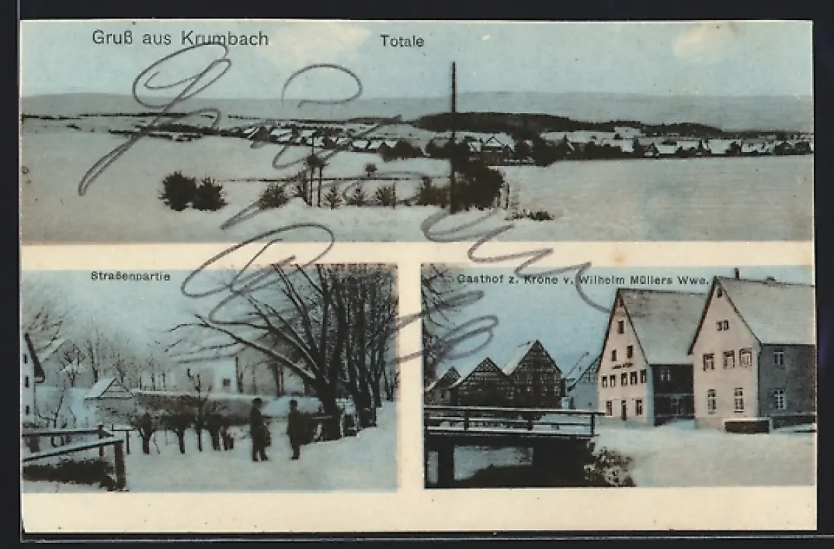 Lithographie Krumbach / Sauldorf, Gasthof zur Krone, Strassenpartie und Totalansicht im Winter