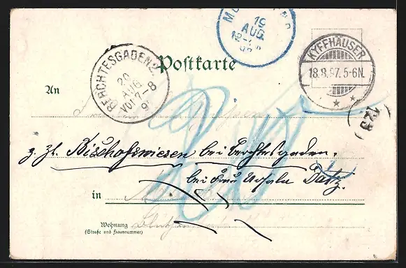 Personenbezogene Daten auf der Rückseite der Karte wurden durch blauen Textmarker unkenntlich gemacht. Die blauen Stellen sind auf die Vorderseite durchgeweicht und wirken sich negativ auf das Postkartenfoto aus