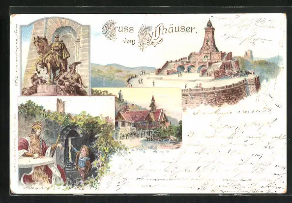Lithographie Kyffhäuser, Gasthaus, Kyffhäuser-Denkmal, Reiterstandbild