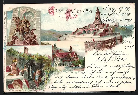 Lithographie Kyffhäuser, Kaiser Wilhelm-Denkmal, Barbarossa