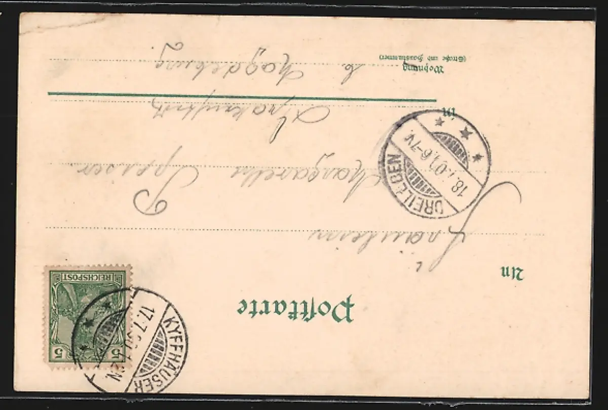 gelaufen 1900, Eckknick re. oben, minimale Einrisse re. oben, guter Zustand