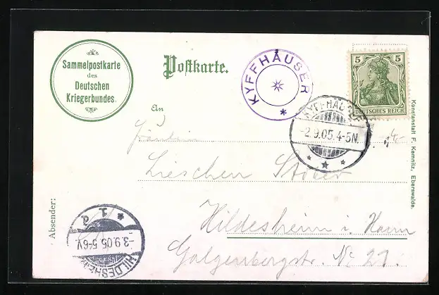 Personenbezogene Daten auf der Rückseite der Karte wurden durch blauen Textmarker unkenntlich gemacht. Die blauen Stellen sind auf die Vorderseite durchgeweicht und wirken sich negativ auf das Postkartenfoto aus