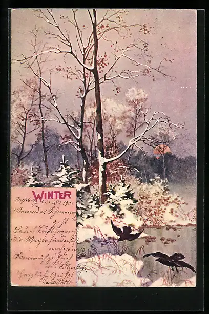 Lithographie L`Hiver, Winterlandschaft mit Raben