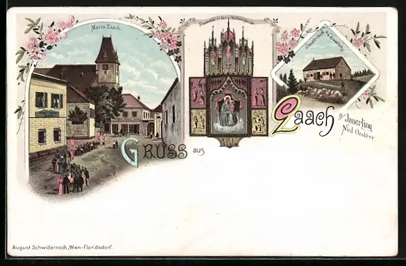 Lithographie Laach a. Jauerling, Maria-Laach, Gnadenbild in der Wallfahrtskirche und Stauferhütte a. d. Jauerling