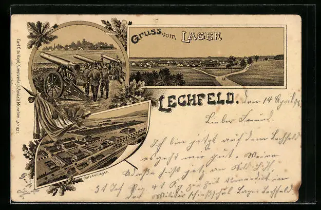 Lithographie Lager-Lechfeld, Ortspanorama, Lager aus der Vogelschau, Kavallerie