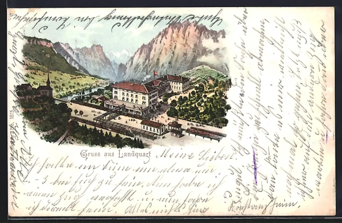Lithographie Landquart, Ortsansicht mit Bahnhof