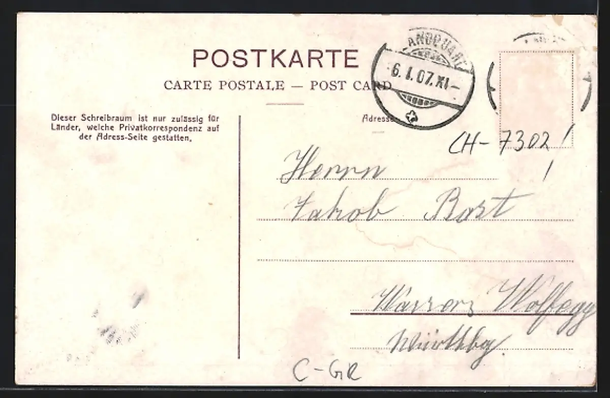 gelaufen 1907, Briefmarke entfernt, Eckknick li. oben, rückseitig Oberflächenschaden, guter Zustand
