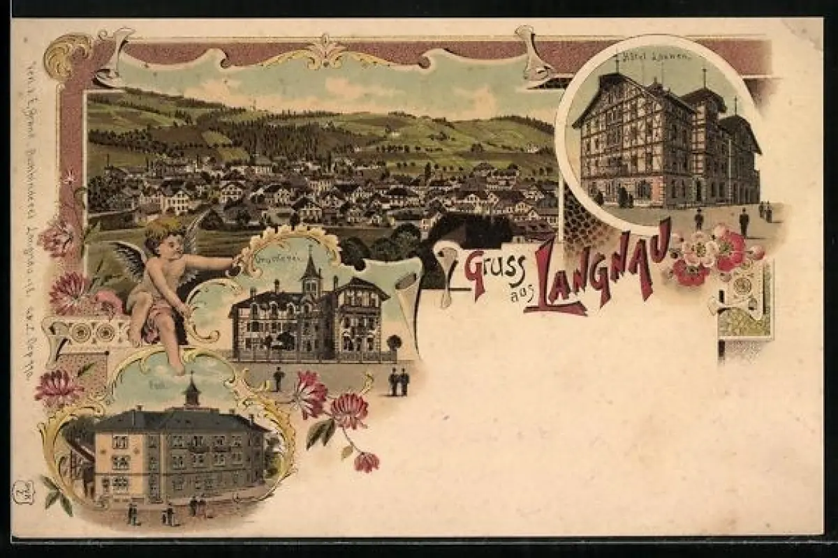Lithographie Langnau /BE, Hotel Loewen, Post, Druckerei, Totalansicht im Passepartout