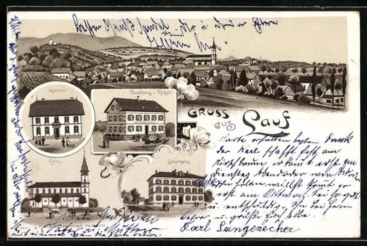 Lithographie Lauf / Baden, Rathaus, Schule, Gasthof Zum Rössl, Kirche, Totalansicht