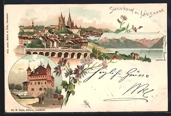 Lithographie Lausanne, Turmgebäude, Ortsansicht mit Viadukt