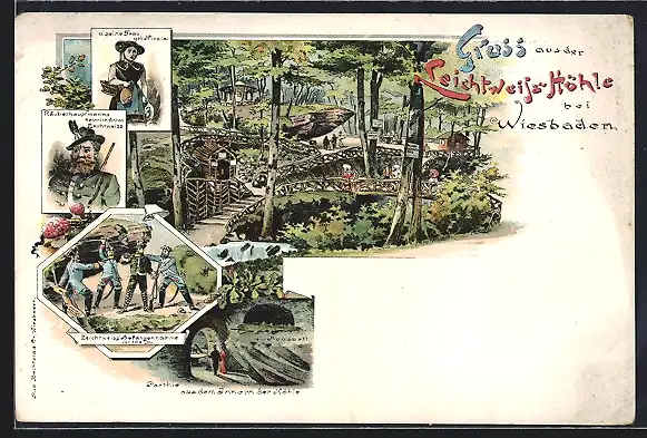 Lithographie Leichtweiss-Höhle, Räuberhauptmann Leichtweiss u. Frau, Gefangennahme, Partie vor der Höhle u. im Innern