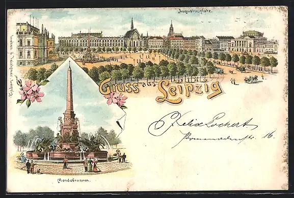 Lithographie Leipzig, Augustusplatz, Mendebrunnen