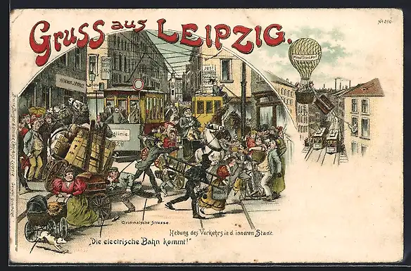 Lithographie Leipzig, Ballon als Möbeltransport, Die electrische Bahn kommt!