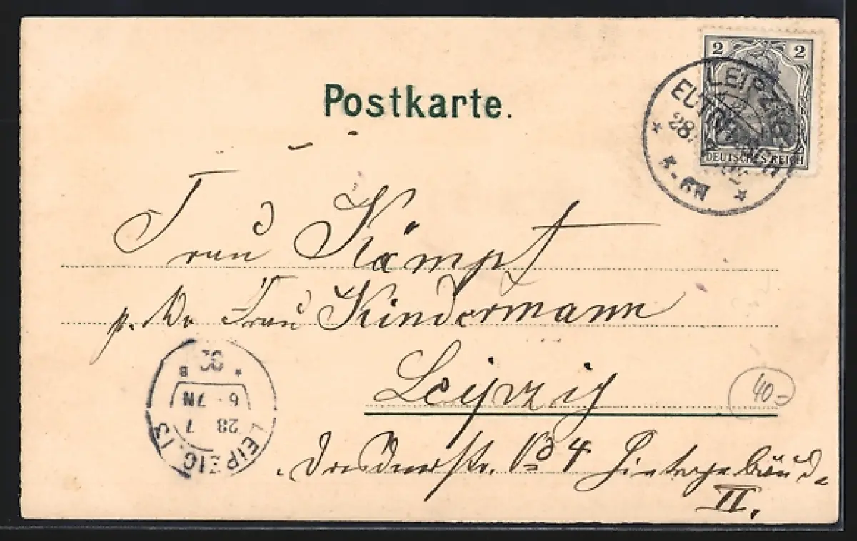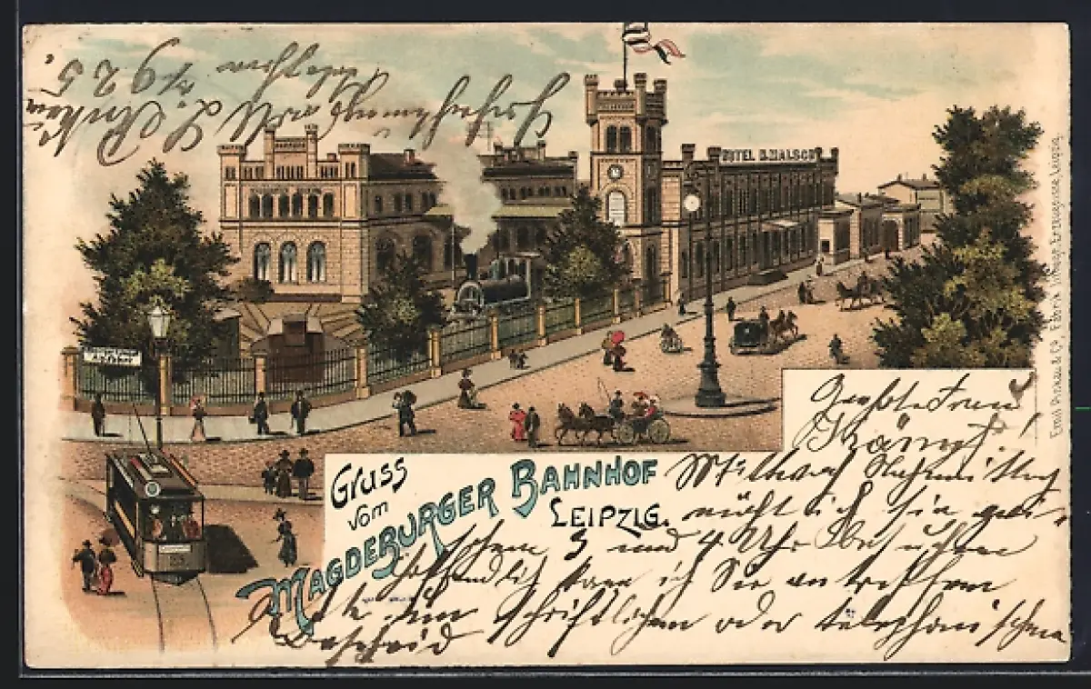Lithographie Leipzig, Magdeburger Bahnhof mit Strassenbahn