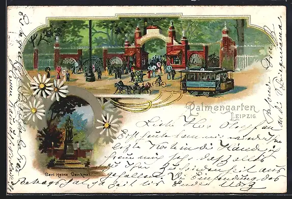 Lithographie Leipzig, Palmengarten mit Strassenbahn, Carl Heine-Denkmal