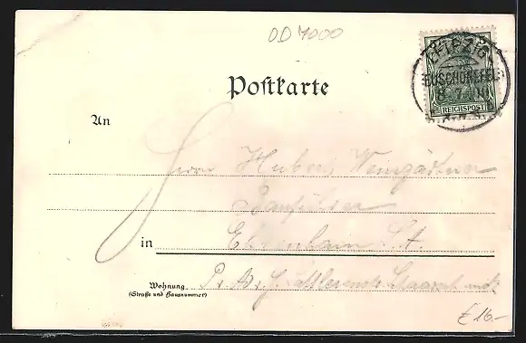 Personenbezogene Daten auf der Rückseite der Karte wurden durch blauen Textmarker unkenntlich gemacht. Die blauen Stellen sind auf die Vorderseite durchgeweicht und wirken sich negativ auf das Postkartenfoto aus