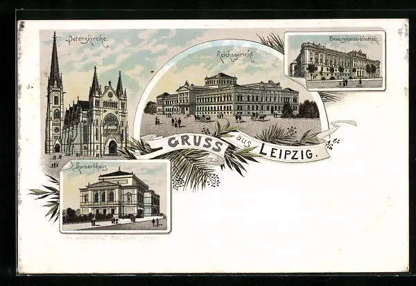 Lithographie Leipzig, Peterskirche, Reichsgericht u. Konzerthaus