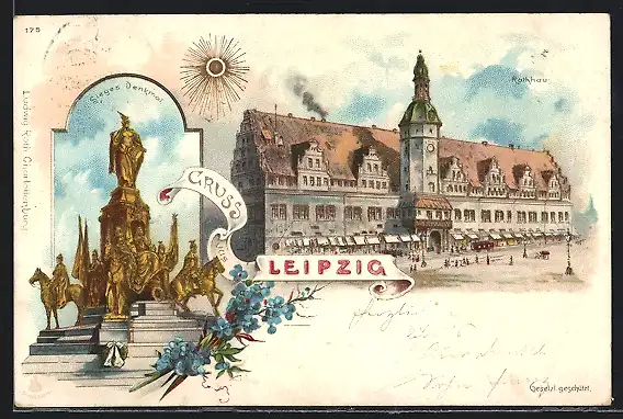 Lithographie Leipzig, Siegesdenkmal und Rathaus