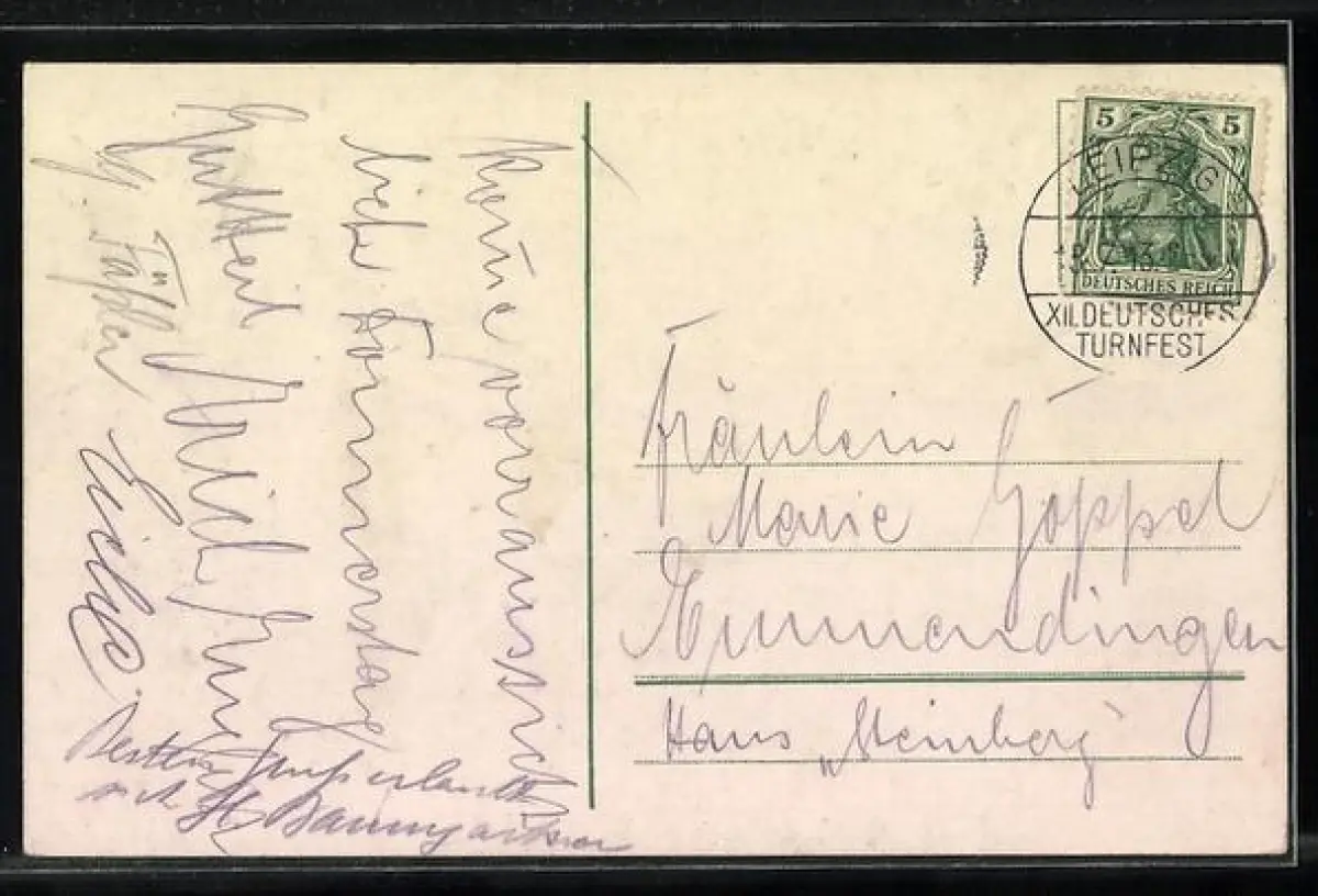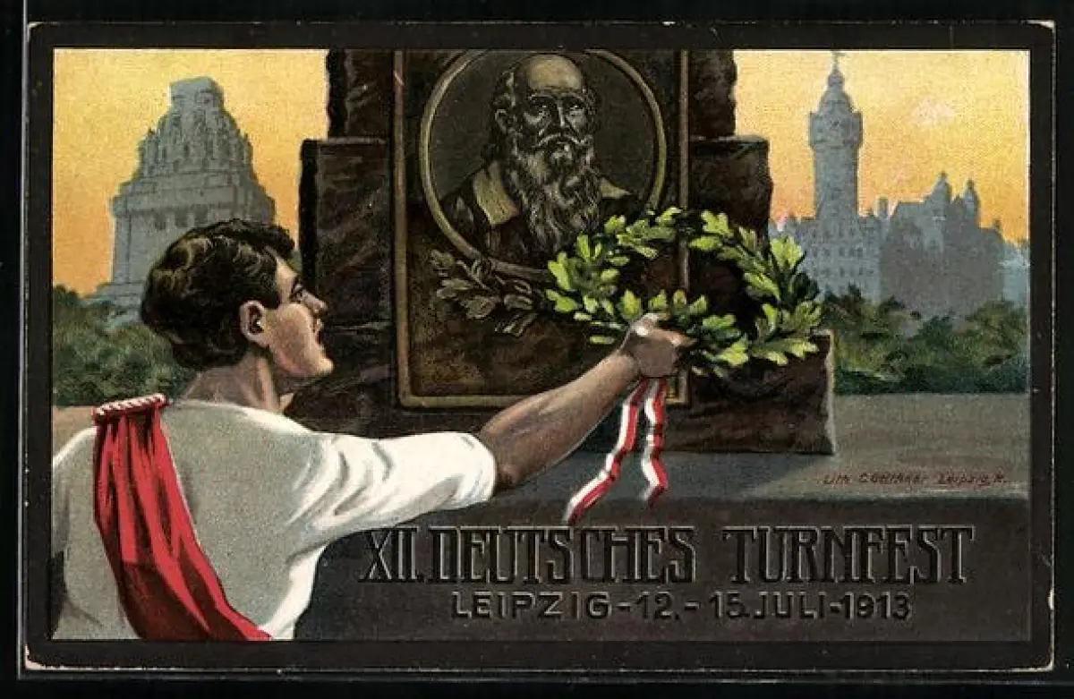 Lithographie Leipzig, XII. Deutsches Turnfest 1913, Turner mit Kranz aus Eichenlaub